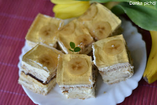 4. Blaszkę wyłożyć folią spożywczą. Ułożyć na niej warstwę herbatników i 1/3 kremu. 4 banany przeciąć wzdłuż na pół, skropić sokiem z cytryny. Ułożyć na kremie i docisnąć. Następnie ułożyć delicje. Wyłożyć kolejną 1/3 kremu. Ułożyć herbatniki. Posmarować resztą kremu. Ułożyć banany pokrojone w plasterki i skropić sokiem z cytryny. Wierzch ciasta polać tężejącą galaretką. Wstawić na noc do lodówki.