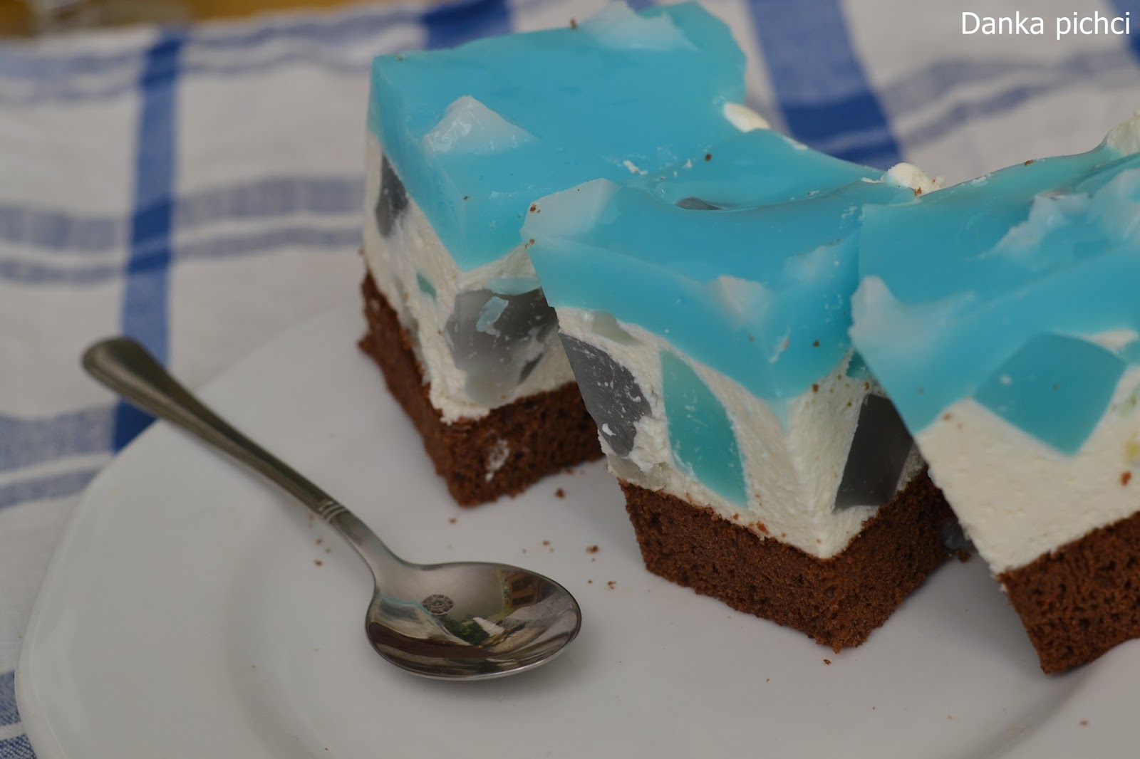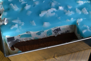 8. Tężejącą niebieską galaretkę wlać na wierzch ciasta, a białą pokroić w płatki i posypać nią niebieską galaretkę.
