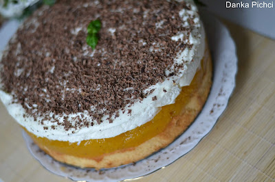 5. Żelatynę rozpuścić w niewielkiej ilości zimnej wody. Gdy napęcznieje naczynie z żelatyną wstawić do gorącej wody, aby się rozpuściła. Schłodzoną śmietanę ubić na sztywno, pod koniec dodać cukier puder i przestudzoną żelatynę. Zmiksować i tężejącą śmietanę wylać na ciasto.