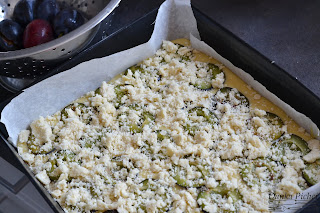 3. Blaszkę wyłożyć papierem do pieczenia i przełożyć ciasto. Na cieście poukładać połówki śliwek (skórką do dołu).