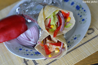 4. Usmażone placki posmarować łyżką majonezu i łyżką ketchupu. Ułożyć na nich poszarpane liście sałaty i pozostałe składniki. Placek zwinąć w rulon i owinąć folią aluminiową.