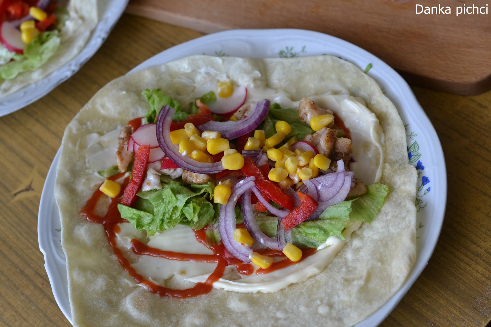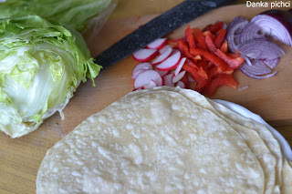 1. Mąkę przesiać na stolnicę. Sól rozpuścić w wodzie. Dodać do mąki. Dolać oliwę i zagnieść jednolite, gładkie ciasto. Gotowe ciasto zawinąć w folię i odstawić na 15-20 minut do lodówki. Po wyjęciu z lodówki podzielić na równe części, podsypać mąką i każdą z nich rozwałkować na grubość 1-2 mm. U mnie wyszło 8 placków o średnicy 20-21 cm. Smażyć na rozgrzanej patelni bardzo krótko z obu stron.