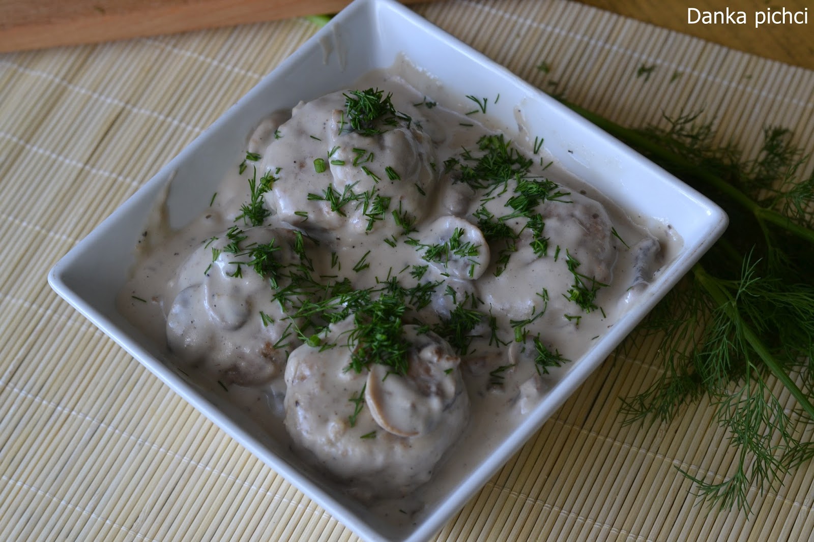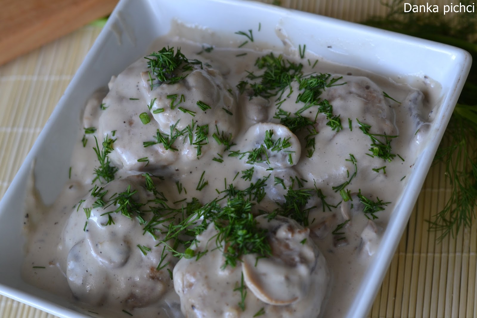 6. Pieczarki oczyścić pokroić w plasterki i dodać na patelnię do cebuli. Posolić i chwilę poddusić, aż puszczą wodę. Następnie wlać śmietankę, dodać przeciśnięty przez praskę czosnek, doprawić pieprzem i ewentualnie solą. Dodać wcześniej podsmażone klopsiki i dusić jeszcze na małym ogniu 10-15 minut, aż sos zgęstnieje. Gotowym daniem posypać pokrojonym koperkiem.