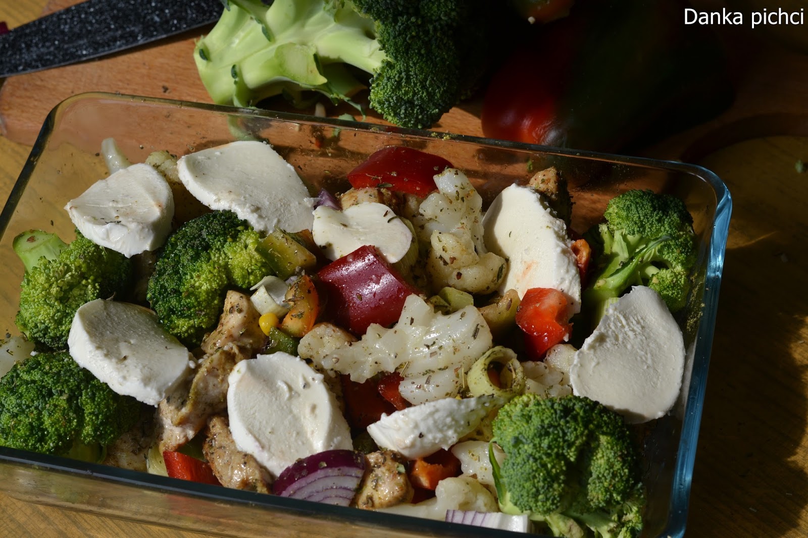 6. Podsmażonego kurczaka przełożyć do warzyw. Posypać kukurydzą. Całość skropić oliwą i doprawić solą, pieprzem, posypać ziołami prowansalskimi i delikatnie wymieszać.