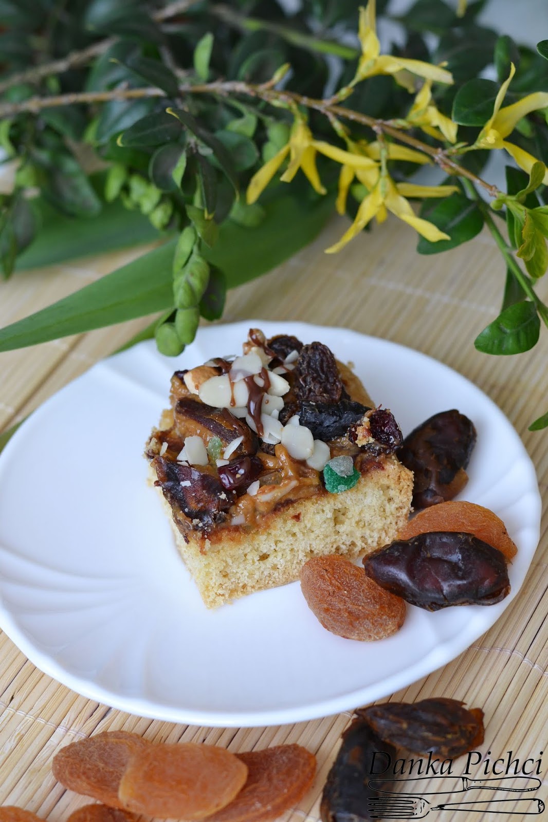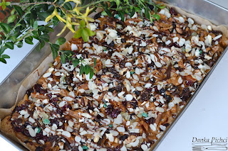 4. Ostudzone ciasto posmarować powidłami. Następnie posmarować kajmakiem. Poukładać bakalie. Można polać czekoladą.