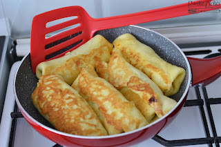 5. Na patelni rozgrzać 2-3 łyżki oleju. Podsmażyć zawinięte naleśniki z każdej strony na złoty kolor.