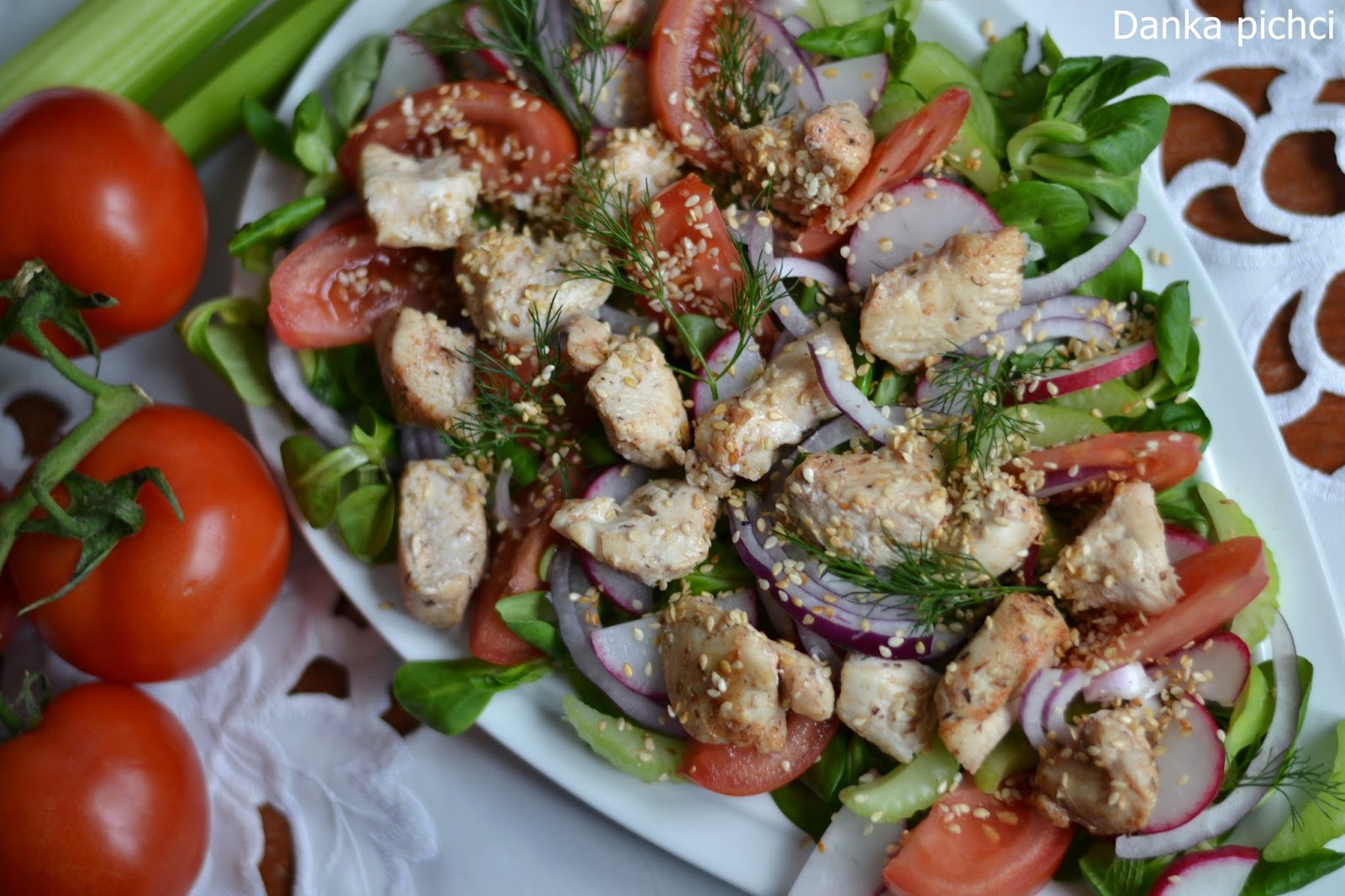 3. Sałatę umyć, osuszyć, rozłożyć na półmisku. Cebulę obrać, pokroić w plasterki, rozłożyć na salacie. Rzodkiewki i pomidory umyć, pokroić, poukładać na półmisku. Seler pokroić w plasterki, dodać do pozostałych składników. Następnie dodać kurczaka, całość posypać uprażonym sezamem.