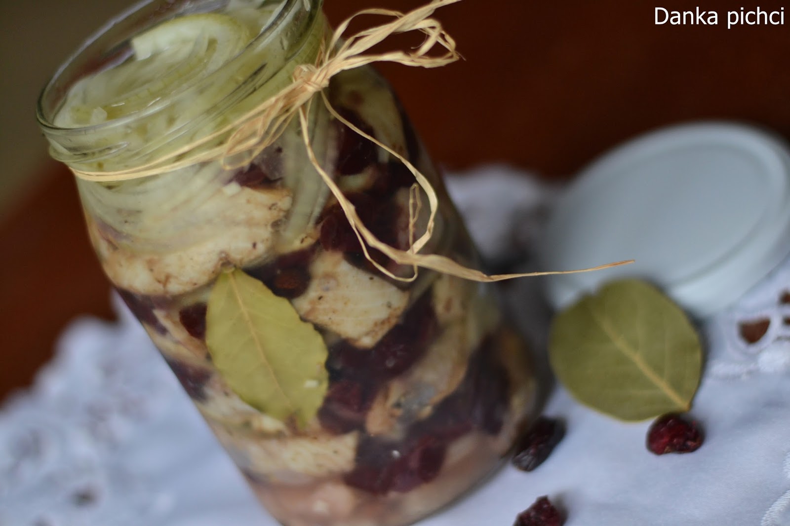 5. Na dnie słoika ułożyć porcję cebuli, na to porcję śledzi, trochę żurawiny, dodać ziele angielskie i liście laurowe, następnie cebulę, śledzie i tak warstwowo do wykorzystania składników. Na wierzchu powinna być cebula. Całość zalać olejem. Przykryć i odstawić do lodówki na 2-3 dni.