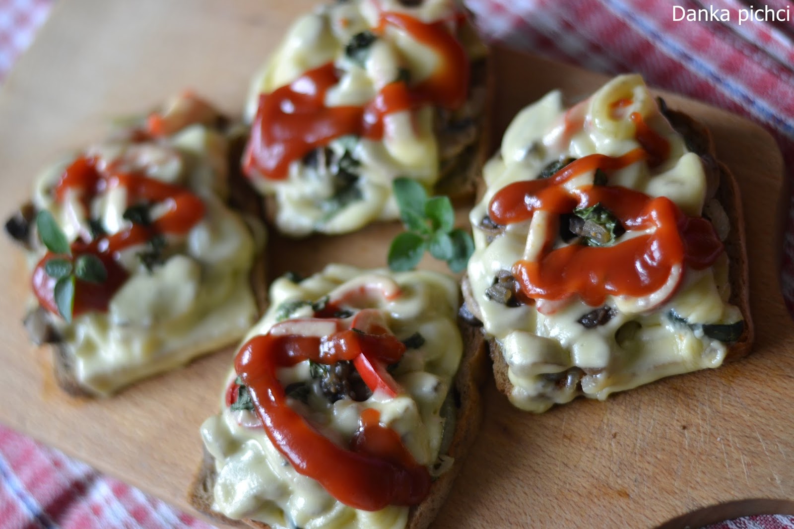 4. Na każdą kromkę chleba położyć trochę pieczarek, cebuli z cukinią, kilka pasków papryki i przykryć plasterkiem sera. Wstawić do piekarnika nagrzanego do 180 st.C. na około 10 minut (do momentu aż ser zacznie się topić).